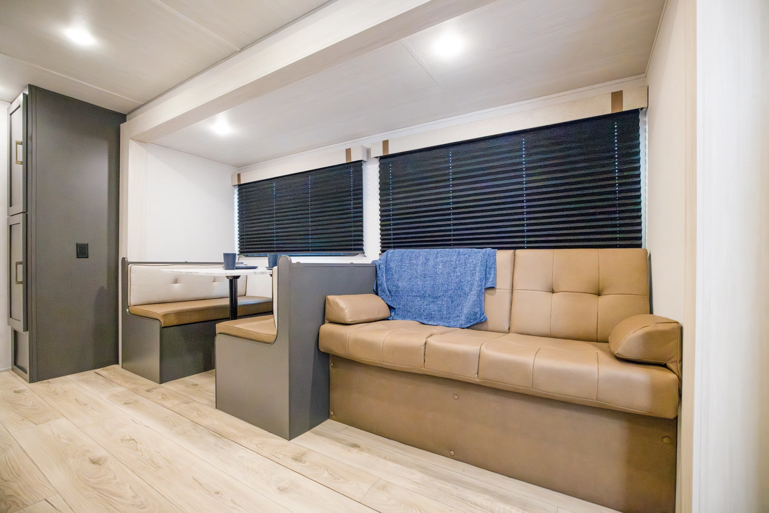 The Ibex New Trail Edition TRAIL28 features a front queen bed, central living area with sofa and dinette, a full kitchen, and a walk-through bath. A private rear bunk room offers four bunks and extra storage. Includes washer/dryer prep, tankless water heater, 50-amp service, and designed with superior construction.