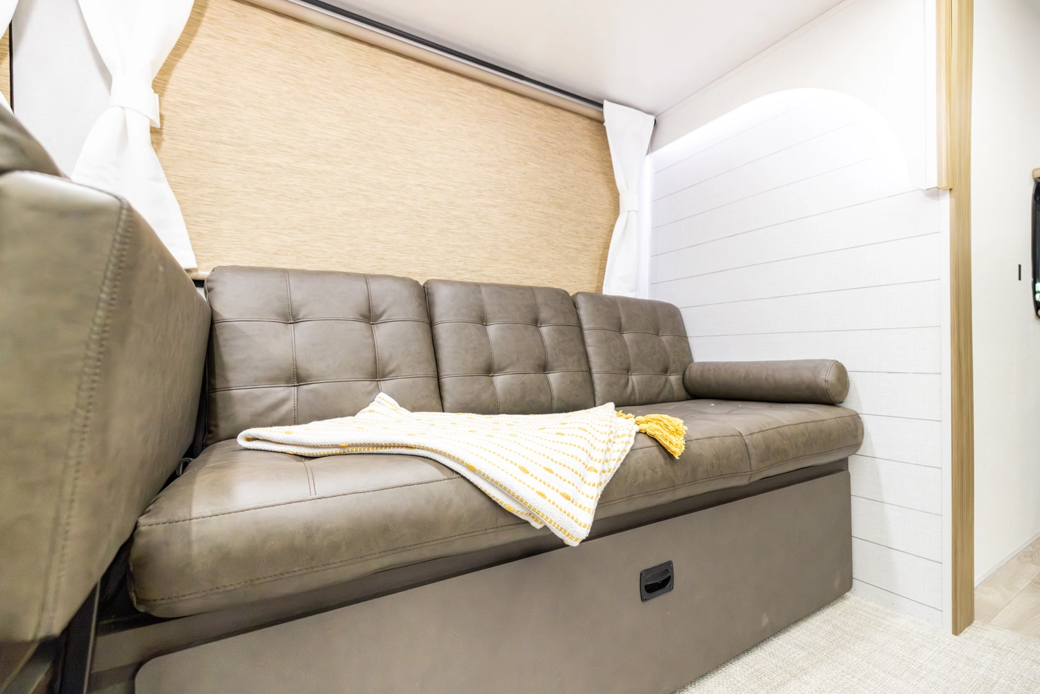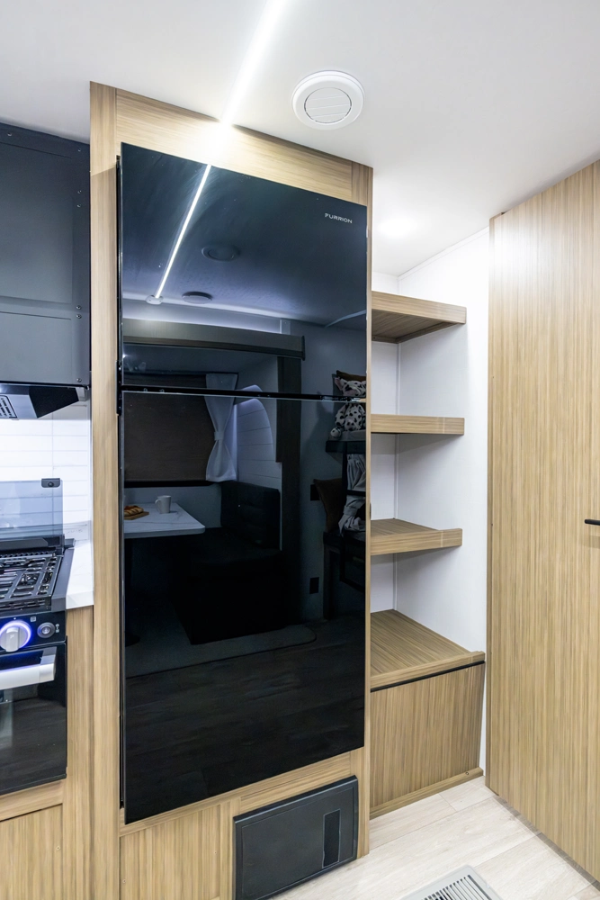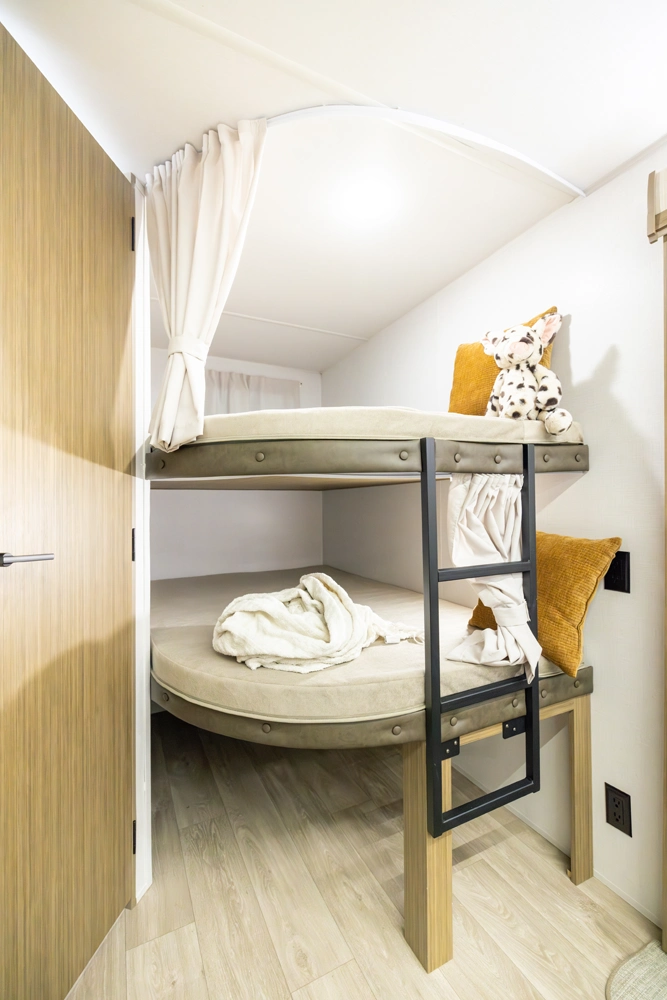 The 26DBUD is the perfect family travel trailer, with double bunks at one end and a queen bedroom at the other. You also get a fireplace (heater), full kitchen with glass-fronted cabinetry and large pantry, a U-dinette, and the customizable Versa-Lounge with Stow N Go Storage.