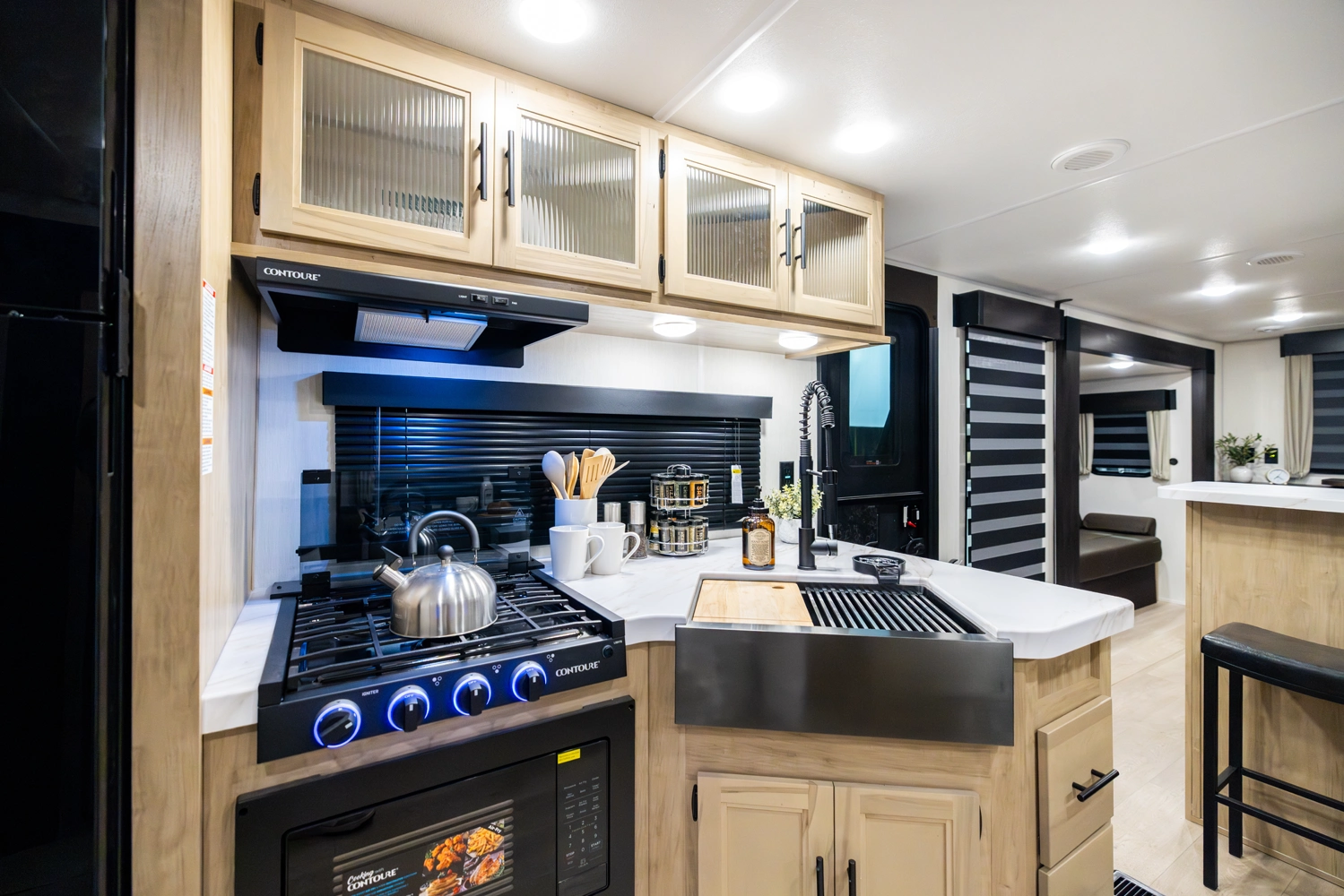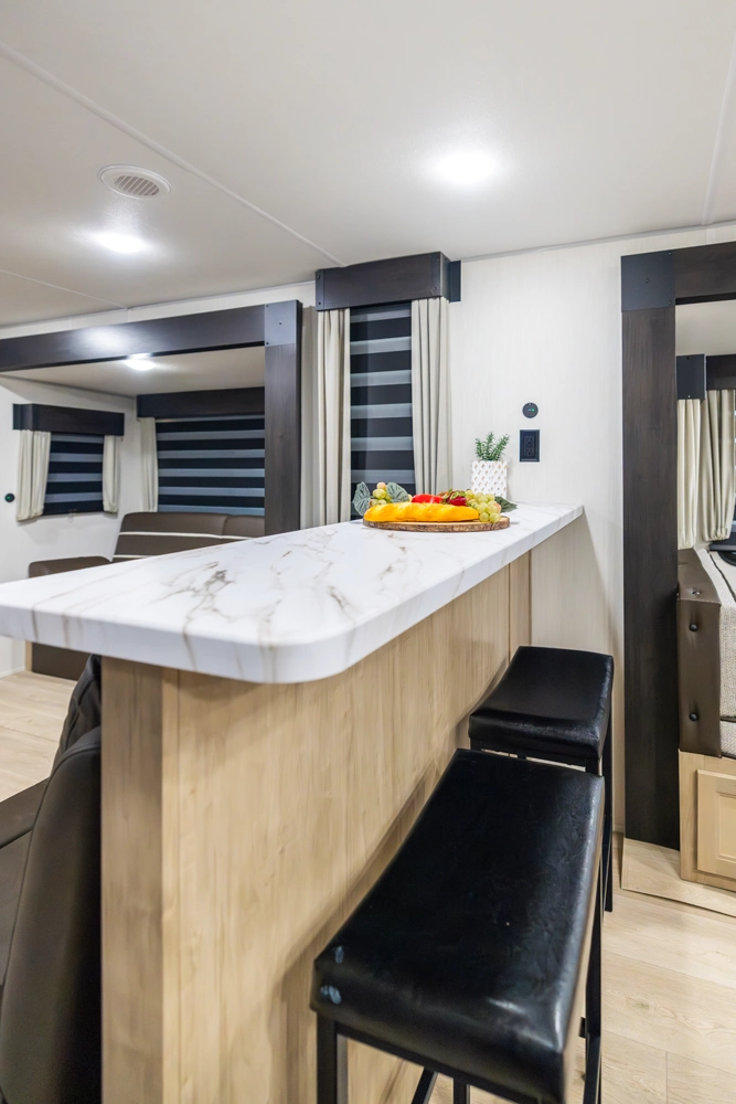 The triple slide is the perfect unit for affordable luxury and livability. The rear entertainment living room is surrounded by panoramic windows as well as two sofa slide and two recliners. The chef’s kitchen, kitchen bar with stools, and dinette slide with slide out drawers and full door pantry offer meet the needs of any chef. The private master suite completes the interior. Outside enjoy the camp kitchen, outside entertainment speakers, and TV bracket under our power awning.
